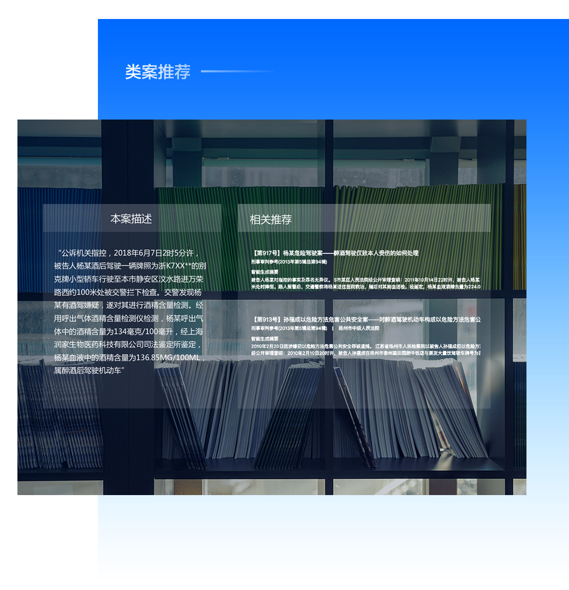 主要面向司法领域,顺利获得从裁判文书、法律法规、司法意见、指导案例等数据中提取案件和人物特征及关系,建立类似案例的模型,对新的案例推荐类似案例